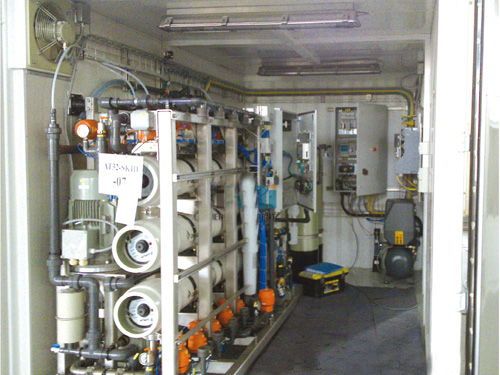 设备简介:6T/H 移动式海水淡化系统。 行业用途:海岛、舰船、海上工作平台,海水淡化生活饮用 产水水质:小于50μs/cm 设备流程:原水→多介质过滤器→活性炭过滤器→精密过滤器→中间水箱→反渗透设备→纯水储水箱→纯水泵→后置保安过滤器→用水点